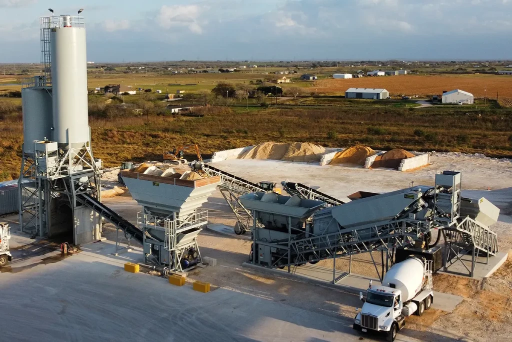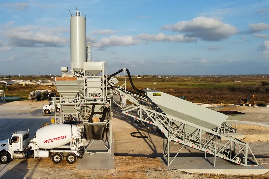 (2) Decumulative Aggregate Batchers, Twin Shaft Mixer ,36 in x 48 ft Transfer Belt, Walkway, Air Dryer, Control Trailer